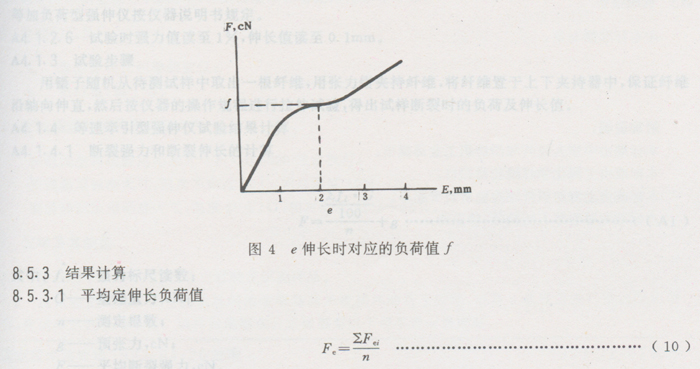 8.5.2.2按8.1.2.2方法进行拉伸试验,仪器自动记录出负荷一伸长曲线,按图4所示方法得出定伸长负荷值(图中所示为试样夹持照离为20mm时,10%定伸长e所对应的强力f)。若强伸仪上有专门测定定伸长负荷或能预置该项目程序的,则可直接得出任意定伸长负荷值。