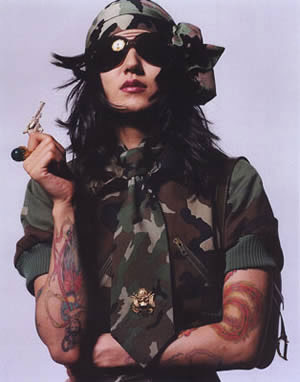 点评:搭配迷彩装扮,妆容也应当相匹配。迷彩装若要配红色妆容,对你的Face是至大考验,除非你有张名模的脸。最保险的当然是淡绿色妆面,若想搞怪,可以向我们的模特学习,用眼影粉在身体上涂一些迷彩线条,很cute的。
