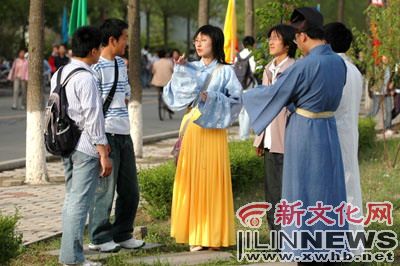 昨日下午分别穿着襦裙、儒服、直衫的3个人在长春市东民主大街上很显眼,路过群众大都停下来围观。