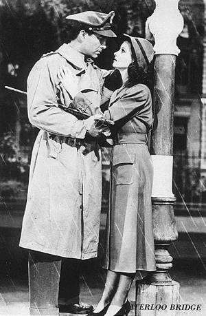 电影《魂断蓝桥》中,男女主角身着风衣站在风雨中。