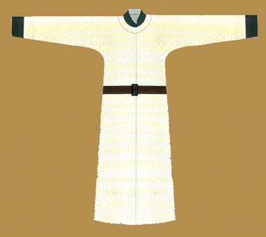 金代贵族服饰 金代服饰略有讲究,男子的常服,通常由四个部分组成,即头裹皂罗巾、身穿盘领衣、腰系吐骼带、脚着乌皮鞋。他们的形制(包括样式、色彩、纹样),都有一些特点。金代服饰有一重要特征,是多用环境色,即穿着与周围环境相同颜色的服装。这与女真族的生活习惯有关,因女真族属于游牧民族,以狩猎为生,服装颜色与环境接近,可以起到保护的作用,冬天多喜用白色,春天则在上衣上锈以“鹘捕鹅”“杂花卉”及熊鹿山林“等动物纹样,同样有麻痹;猎物、保护自己的作用。本图为圆领窄袖袍展示图。