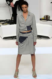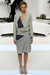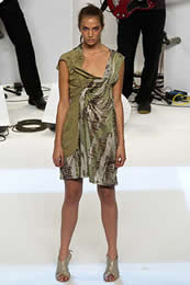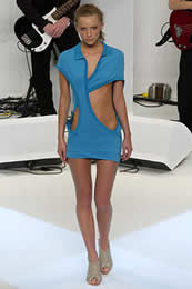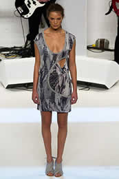 Hussein Chalayan的设计处处体现了他的才智,优美雅致,而最低限度也是光彩照人的。珠饰是Chalayan的礼服设计中常用的分割方式,几何或曲线的分割结构也是他的特点。抽象的装饰图案灵感可能来自于飞机的飞行路线,也可能是气象云层图。而且Chalayan总是巧妙地将服装的装饰融入结构中,例如,宽松的背上有大波浪衣褶镶嵌的直筒连衣裙,和打着不规则活褶的A字裙等等。