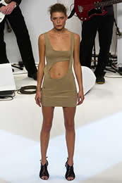 虽然比起他的同乡John Galliano和Alexander McQueen而言,他是安静了好多,也书卷气了好多,但是他的设计顶点并不止于这些鸡毛蒜皮。他在调动扣人心弦,有时候甚至有些骇人的形象方面是个老手。还记得98年春夏季系列中,一溜衣架般的排骨模特从裸体到全幅封裹,在T型台上展览,你看了,恐怕一生都难于忘记吧。再有就是98/99年的秋冬系列中,模特唇上被封上了红色的塑料方块,或者头被装进一个大的木头盒子里。这些形象真的很有用,一下子就抓住了我们的视线。