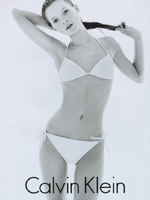 上个世纪八十年代,CK酷裤特别启用了当时刚刚成年的青春玉女明星波姬·小丝出任牛仔服装的广告女郎,只见她甩动着飘拂的秀发,一只手轻轻地搭在臀部,一把很磁性的嗓子说:"There’s nothing between Calvin and me"(我和Calvin亲密无间) 这在暗示她穿着CK内裤。尤其这几个夏天,处处都是身着“露、透、瘦、简”衫裙的美女裙裾飘飘,“纯色、表面光滑无缝痕”的CK内衣就挺身而出了。它能够和身体融为一体,表面极度简洁的内衣开始和时装完美结合。那些微妙处只让你感觉一种欲望,性感、色诱、奢华、激情,就像一场可以期待的艳遇。
