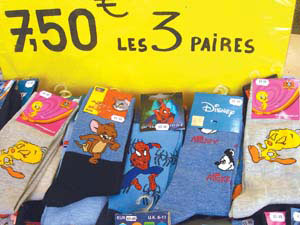 在傅雷翻译的巴尔扎克的《幻灭》中有这样一段话:“矮小的夏布瓦梭头发扑着粉,穿着似绿非绿的外套,栗色背心,黑扎脚裤,花袜子,一双皮鞋踏在地上咯吱咯吱地响……”看来花袜子在法国历史悠久,只是到了现代才发展出卡通图案,也算把老祖宗的传统发扬光大了。