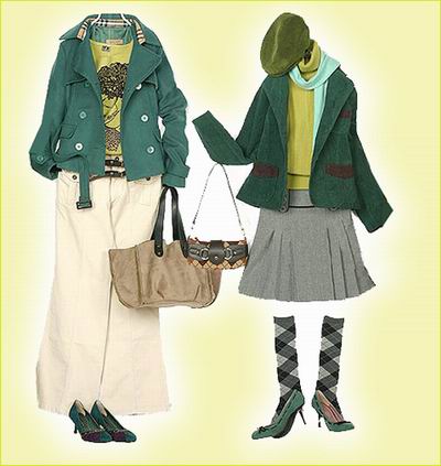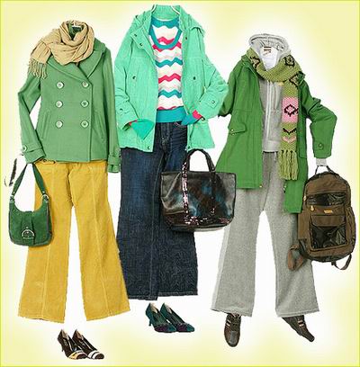 (左)感觉稳重的绿色翻领外套,双排扣设计非常典雅,搭配黄色明线灯心绒长裤,柔和温暖的配色使你的形象更具女人味。(中)鲜艳的绿色棉外套当然很保暖,冬天穿既活泼又舒适,休闲的款式搭配小喇叭裤刚刚好。(右)同样是绿色外套,搭配一条草绿色围巾更显可爱。