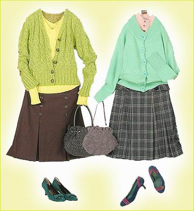(左)秋日的草地总是那么温暖,黄绿色给人丰盛安稳的感觉,搭配明亮的柠檬黄恤衫和深棕色褶裙,家居装扮也要精心选择才是。(右)绿色的跳脱与粉色的温柔,再加上格子的情调,糅合在一起便成了贴心的浪漫。
