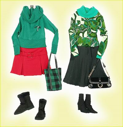 (左)墨绿色翻领毛衫,宽边及大翻领相当妩媚,搭配颜色很冲的红色褶裙,给人鲜明的视觉刺激。(右)成熟的你可以尝试印花面料,诡谲的图案带着艺术气息,配一条典雅的大摆裙,典雅的形象让人印象深刻。