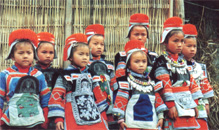 妇女上装为长袖口处绣有红、绿、蓝色线的花纹,两襟下端各有一条长带相连,在离带端一寸处左右,用红色或绿色线绣成形如狗尾的花纹。穿时左右两襟对压,襟端两条长带于前腰交叉向后腰围扎垂于臀部,并用一尺左右的方布围在后腰。下装为齐膝黑色裤,并用不着长、宽一尺左右的黑布裹腿。瑶族男装一般为黑色对襟衣和黑色或蓝色长裤下装,同时也有穿着仅至臀上的黑色大襟铜扣短衣和黑色肥而稍短的扎腰便裤,头包黑色头帕。
